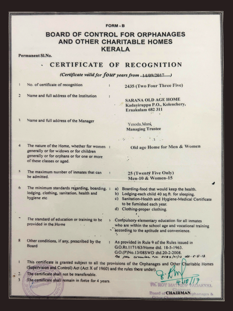 55 വയസിനുമേൽ പ്രായമുള്ള അച്ചന്മാർക്കും അമ്മമാർക്കും ശരണ ഓൾഡേജ് ഹോമിൽ പ്രവേശനം നൽകിവരുന്നു.കൂടാതെ റെയിൽവേസ്റ്റേഷനുകൾ ക്ഷേത്രപരിസരങ്ങൾ ബസ്സ്റ്റാന്റുകൾ മറ്റു പൊതു സ്ഥലങ്ങളിലും കാണുന്ന ആശ്രിതരില്ലാത്ത വൃദ്ധജനങ്ങളെ പോലീസുകാർ മുഖേന ശരണ ഓൾഡേജ് ഹോമിൽ എത്തിക്കുകയും അവർക്ക് ഒരു ആശ്രയകേന്ദ്രമായി മാറുകയാണ് ശരണ ഓൾഡേജ് ഹോം. വാർദ്ധക്യ കാലത്ത് സ്വന്തം കാര്യങ്ങൾ ചെയ്യാൻ പ്രാപ്തി നഷ്ട്ടപെട്ട വൃദ്ധജനങ്ങൾക്ക് ആശ്രയകേന്ദ്രമാണ് ഈ സ്ഥാപനം. എല്ലാ മാസത്തിലും ഐക്കരനാട് ഗ്രാമപഞ്ചായത്തിലെയും ബ്ലോക്ക്പഞ്ചായത്തിലെയും പാലിയേറ്റീവ് കെയർ യൂണിറ്റിലെ സേവനവും ഡോക്ടർമാരുടെ സേവനവും നമ്മളുടെ ഈ സ്ഥാപനത്തിൽ ലഭ്യമാണ്. പലവിധ ആഗ്രഹങ്ങളും മനസ്സിൽ വെച്ച് ജീവിതത്തിൽ സ്വന്തം മക്കൾക്ക് ജന്മം നൽകിയ മാതാപിതാക്കൾ അവസാനനാളുകളിൽ ആ മക്കൾ കൈയ്യൊഴിയുമ്പോൾ നിറകണ്ണുകളോടെ വിദൂരതയിലേക്ക് നോക്കി നിൽക്കുന്ന മാതാപിതാക്കളുടെ മാസസ്സുകളിൽ സന്തോഷത്തിന്റെയും സംതൃപ്തിയുടെയും നാളുകൾ സൃഷ്ടിച്ച് അവരുടെ ജീവിതം പൂർണ്ണമാക്കാൻ ശരണ ഓൾഡേജ് ഹോം നിങ്ങൾക്ക് ഒരു ശരണ കേന്ദ്രമായി മാറിയിരിക്കുന്നു. ഇവിടെ കിടപ്പുരോഗികളെയും മാനസിക രോഗികളെയും താമസിപ്പിക്കുന്നു.